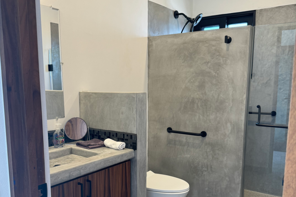 The 600 square feet of upstairs’ space is slightly different within each house – intentionally designed to serve a diverse make-up of guests. Both include two bedrooms, each sleeping 2 people in a queen bed with en-suite bathrooms and outdoor decks.